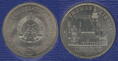 5 Mark; 26. Juni 1984; Schön 99; Leipzig, Thomaskirche; Vs.: A / Emplem der DDR und oben umlaufend: DEUTSCHE DEMOKRATISCHE REPUBLIK und unten umlaufend: 1984 5 MARK; Rs.: Leipziger Thomaskirche und oben umlaufend: T H O M A S K I R C H E und unten: LEIPZIG; Glatter Rand mit: 5 MARK * 5 MARK * 5 MARK * 5 MARK *; Neusilber; Dm=29,0mm; Gewicht=9,6 g; Auflagenhöhe: 211.540 Stück; Gestaltung: Heinz Rodewald, Berlin |