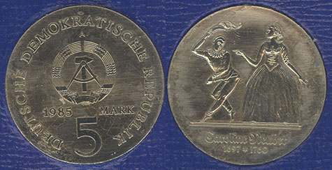 5 Mark; 5. Juli 1985; Schön 103; 225. Todestag von Caroline Neuber; Vs.: A / Emplem der DDR und oben umlaufend: DEUTSCHE DEMOKRATISCHE REPUBLIK und unten umlaufend: 1985 5 MARK; Rs.: Zwei Schauspieler / Caroline Neuber / 1697 * 1760; Glatter Rand mit: 5 MARK * 5 MARK * 5 MARK * 5 MARK *; Neusilber; Dm=29,0mm; Gewicht=12,2 g; Auflagenhöhe: 51.825 Stück; Gestaltung: Sneschana Russewa-Hoyer (Grafikerin), Berlin Heinz Hoyer (Bildhauer), Berlin |