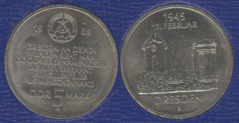 5 Mark; 5. Februar 1985; Schön 105; Dresden, Frauenkirche; Vs.: 19 Emplem der DDR 85 / DRESDEN, AN DEINEN / WUNDEN SIEHT MAN / DIE QUAL DER NAMENLOSEN / DIE HIER VERBRANNT / IM HÖLLENFEUER / AUS MENSCHENHAND / DDR 5 MARK / A; Rs.: 1945 / 13. FEBRUAR / Frauenkirche / DRESDEN / R; Glatter Rand mit: 5 MARK * 5 MARK * 5 MARK * 5 MARK *; Neusilber; Dm=29,0mm; Gewicht=9,6 g; Auflagenhöhe: 195.000 Stück; Gestaltung: Heinz Rodewald, Berlin |