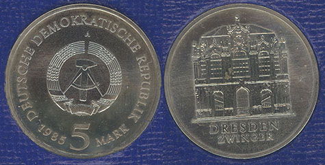 5 Mark; 5. Februar 1985; Schön 104; Vs.: A / Emplem der DDR und oben umlaufend: DEUTSCHE DEMOKRATISCHE REPUBLIK und unten umlaufend: 1985 5 MARK; Rs.: Wallpavillon des Dresdner Zwingers / DRESDEN / ZWINGER; Glatter Rand mit: 5 MARK * 5 MARK * 5 MARK * 5 MARK *; Neusilber; Dm=29,0mm; Gewicht=9,6 g; Auflagenhöhe: 194.520 Stück; Gestaltung: Heinz Rodewald, Berlin |