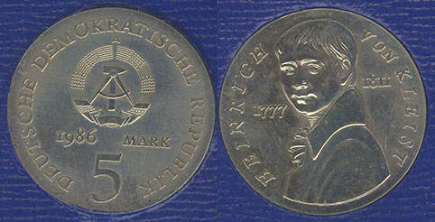 5 Mark; 21. August 1986; Schön 110; 175. Todestag von Heinrich von Kleist; Vs.: A / Emplem der DDR / 1986 MARK / 5 und oben umlaufend: DEUTSCHE DEMOKRATISCHE REPUBLIK; Rs.: Brustbild Kleist und links 1777 und rechts: 1811 und oben umlaufend: H E I N R I C H V O N K L E I S T; Glatter Rand mit: 5 MARK * 5 MARK * 5 MARK * 5 MARK *; Neusilber; Dm=29,0mm; Gewicht=12,2 g; Auflagenhöhe: Stück; Gestaltung: Sneschana Russewa-Hoyer (Grafikerin), Berlin Heinz Hoyer (Bildhauer), Berlin |
