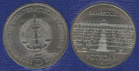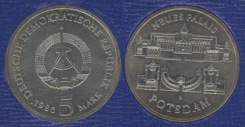 5 Mark; 26. Juni 1986; Schön 112; Potsdam, Neues Palais (200. Todestag von Friedrich dem Großen); Vs.: A / Emplem der DDR und oben umlaufend: DEUTSCHE DEMOKRATISCHE REPUBLIK und unten umlaufend: 1986 5 MARK; Rs.: NEUES PALAIS / Bilddarstellung / R / POTSDAM; Glatter Rand mit: 5 MARK * 5 MARK * 5 MARK * 5 MARK *; Neusilber; Dm=29,0mm; Gewicht=9,6 g; Auflagenhöhe: Stück; Gestaltung: Heinz Rodewald, Berlin |