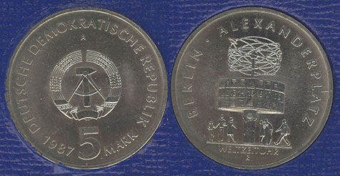 5 Mark; 16. Januar 1987; Schön 115; 750 Jahre Berlin – Alexanderplatz; Vs.: A / Emplem der DDR und oben umlaufend: DEUTSCHE DEMOKRATISCHE REPUBLIK und unten umlaufend: 1987 5 MARK; Rs.: Weltzeituhr / WELTZEITUHR / R und oben umlaufend: B E R L I N • A L E X A N D E R P L A T Z; Glatter Rand mit: 5 MARK * 5 MARK * 5 MARK * 5 MARK *; Neusilber; Dm=29,0mm; Gewicht=9,6 g; Auflagenhöhe: 474.801 Stück; Gestaltung: Heinz Rodewald, Berlin |
