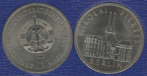 5 Mark; 16. Januar 1987; Schön 113; 750 Jahre Berlin – Nikolaiviertel; Vs.: A / Emplem der DDR und oben umlaufend: DEUTSCHE DEMOKRATISCHE REPUBLIK und unten umlaufend: 1987 5 MARK; Rs.: Berliner Nikolai-Viertel / B E R L I N und oben umlaufend: N I K O L A I V I E R T E L; Glatter Rand mit: 5 MARK * 5 MARK * 5 MARK * 5 MARK *; Neusilber; Dm=29,0mm; Gewicht=9,6 g; Auflagenhöhe: 468.801 Stück; Gestaltung: Joachim Rieß (Grafiker), Chemnitz Volker Beier (Bildhauer), Chemnitz |
