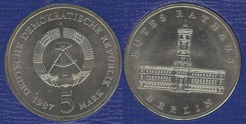 5 Mark; 16. Januar 1987; Schön 114; 750 Jahre Berlin – Rotes Rathaus; Vs.: Emplem der DDR und oben umlaufend: DEUTSCHE DEMOKRATISCHE REPUBLIK und unten umlaufend: 1987 5 MARK; Rs.: Rotes Rathaus und oben umlaufend: R O T E S R A T H A U S und unten umlaufend: B E R L I N; Glatter Rand mit: 5 MARK * 5 MARK * 5 MARK * 5 MARK *; Neusilber; Dm=29,0mm; Gewicht=9,6 g; Auflagenhöhe: 473.810 Stück; Gestaltung: Sneschana Russewa-Hoyer (Grafikerin), Berlin Heinz Hoyer (Bildhauer), Berlin |