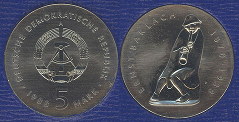 5 Mark; 18. Februar 1988; Schön 120; 50. Todestag von Ernst Barlach; Vs.: A / Emplem der DDR und oben umlaufend: * DEUTSCHE DEMOKRATISCHE REPUBLIK * und unten umlaufend: 1988 5 MARK; Rs.: "Der Flötenbläser" und oben umlaufend: E R N S T B A L A C H 1 8 7 0 - 1 9 3 8; Glatter Rand mit: 5 MARK * 5 MARK * 5 MARK * 5 MARK *; Neusilber; Dm=29,0mm; Gewicht=12,2 g; Auflagenhöhe: 51.601 Stück; Gestaltung: Joachim Rieß (Grafiker), Chemnitz Heinz Hoyer (Bildhauer), Berlin |