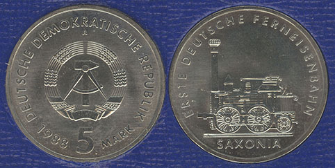 5 Mark; 18. Februar 1988; Schön 118; 150 Jahre Ferneisenbahn in Deutschland (Lokomotive Saxonia); Vs.: A / Emplem der DDR und oben umlaufend: DEUTSCHE DEMOKRATISCHE REPUBLIK und unten umlaufend: 1988 5 MARK; Rs.: Saxonia-Lokomotive / SAXONIA und oben umlaufend: E R S T E D E U T S C H E F E R N E I S E N B A H N; Glatter Rand mit: 1839 LEIPZIG–DRESDEN; Neusilber; Dm=29,0mm; Gewicht=9,6 g; Auflagenhöhe: 366.800 Stück; Gestaltung: Wilfried Klink (Grafiker), Berlin Bettina Klink-von Woyski (Bildhauerin), Berlin |