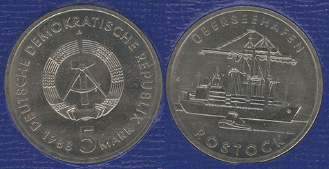 5 Mark; 18. Februar 1988; Schön 119; 30 Jahre Überseehafen Rostock; Vs.: A / Emplem der DDR und oben umlaufend: DEUTSCHE DEMOKRATISCHE REPUBLIK und unten umlaufend: 1988 5 MARK; Rs.: Schiffe und oben umlaufend: Ü B E R S E E H A F E N und unten umlaufend: R O S T O C K; Glatter Rand mit: OSTSEE * EIN MEER DES FRIEDENS *; Neusilber; Dm=29,0mm; Gewicht=9,6 g; Auflagenhöhe: 366.800 Stück; Gestaltung: Heinz Rodewald, Berlin |