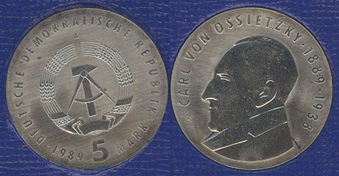 5 Mark; 9. Mai 1989; Schön 128; 100. Geburtstag von Carl von Ossietzky; Vs.: A / Emplem der DDR und oben umlaufend: * DEUTSCHE DEMOKRATISCHE REPUBLIK * und unten umlaufend: 1989 5 MARK; Kopf Ossietzky nach links blickend und oben umlaufend: CARL VON OSSIETZKY • 1889-1938; Glatter Rand mit: 5 MARK * 5 MARK * 5 MARK * 5 MARK *; Neusilber; Dm=29,0mm; Gewicht=12,2 g; Auflagenhöhe: 50.400 Stück; Gestaltung: Dietrich Dorfstecher (Grafiker), Berlin Gerhard Rommel (Bildhauer), Berlin |