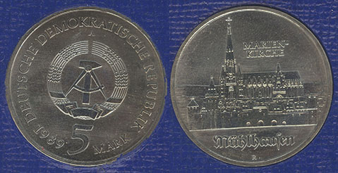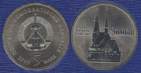 5 Mark; 23. Februar 1989; Schön 124; 500. Geburtstag von Thomas Müntzer – Katharinenkirche in Zwickau; Vs.: A / Emplem der DDR und oben umlaufend: DEUTSCHE DEMOKRATISCHE REPUBLIK und unten umlaufend: 1989 5 MARK; Rs.: Katharinenkirche in Zwickau und links: KATHA- / RINEN- / KIRCHE und rechts: Zwickau; Glatter Rand mit: THOMAS MÜNTZER 1489–1525; Neusilber; Dm=29,0mm; Gewicht=9,6 g; Auflagenhöhe: 362.440 Stück; Gestaltung: Wilfried Klink (Grafiker), Berlin Bettina Klink-von Woyski (Bildhauerin), Berlin |