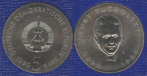 5 Mark; 15. Februar 1990; Schön 134; 100. Geburtstag von Kurt Tucholsky; Vs.: A / Emplem der DDR und oben umlaufend: DEUTSCHE DEMOKRATISCHE REPUBLIK und unten umlaufend: 1990 5 MARK; Rs.: Kopf Tucholsky R und oben umlaufend: K U R T T U C H O L S K Y und unten umlaufend: 1890 1935; Glatter Rand mit: 5 MARK * 5 MARK * 5 MARK * 5 MARK *; Neusilber; Dm=29,0mm; Gewicht=12,2 g; Auflagenhöhe: 50.171 Stück; Gestaltung: Heinz Rodewald, Berlin |