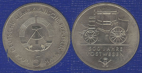 5 Mark; 15. Februar 1990; Schön 131; 500 Jahre Postwesen, Vs.: A / Emplem der DDR und oben umlaufend: DEUTSCHE DEMOKRATISCHE REPUBLIK und unten umlaufend: 1990 5 MARK; Rs.: Postkutsche / 5 0 0 J A H R E / P O S T W E S E N / Posthorn; Glatter Rand mit: 5 MARK * 5 MARK * 5 MARK * 5 MARK *; Neusilber; Dm=29,0mm; Gewicht=9,6 g; Auflagenhöhe: 366.320 Stück; Gestaltung: Wilfried Klink (Grafiker), Berlin Bettina Klink-von Woyski (Bildhauerin), Berlin |