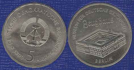 5 Mark; 1990; Schön 34.m; Berlin, Hauptstadt der DDR (Brandenburger Tor); Vs.: A / Emplem der DDR und oben umlaufend: DEUTSCHE DEMOKRATISCHE REPUBLIK und unten umlaufend: 1981 5 MARK; Rs.: Brandenburger Tor und oben umlaufend: H A U P T S T A D T D E R D D R und unten umlaufend: B E R L I N; Glatter Rand mit: 5 MARK * 5 MARK * 5 MARK * 5 MARK *; Neusilber; Dm=29,0mm; Gewicht=9,6 g; Auflagenhöhe: 50.500 Stück; Gestaltung: Axel Bertram (Grafiker), Berlin Wilfried Fitzenreiter (Bildhauer), Berlin |
