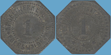 1 Pfennig; o. J., 1917; Hasselmann 296.1; Vs.: ARDELTWERKE G.M.B.H. * EBERSWALDE * um Wertzahl; Rs.: KLEINGELDERSATZMARKE; Zink; Dm=16,5mm 8eckig; Prägung bei Christian Lauer in Nürnberg |