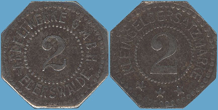 2 Pfennige; o. J., 1918; Hasselmann 296.7; Vs.: ARDELTWERKE G.M.B.H. * EBERSWALDE * um Wertzahl; Rs.: KLEINGELDERSATZMARKE; Eisen; Dm=18,2mm 8eckig; Prägung bei Christian Lauer in Nürnberg |