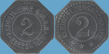 2 Pfennige; o. J., 1917; Hasselmann 296.2; Vs.: ARDELTWERKE G.M.B.H. * EBERSWALDE * um Wertzahl; Rs.: KLEINGELDERSATZMARKE; Zink; Dm=18,0mm 8eckig; Prägung bei Christian Lauer in Nürnberg |
