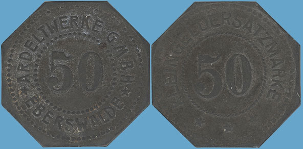 50 Pfennige; o. J., 1917; Hasselmann 296.5; Vs.: ARDELTWERKE G.M.B.H. * EBERSWALDE * um Wertzahl; Rs.: KLEINGELDERSATZMARKE; Zink; Dm=24,5mm 8eckig; Prägung bei Christian Lauer in Nürnberg |