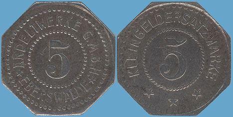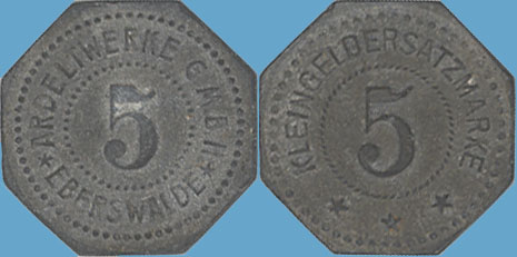 5 Pfennige; o. J., 1917; Hasselmann 296.3; Vs.: ARDELTWERKE G.M.B.H. * EBERSWALDE * um Wertzahl; Rs.: KLEINGELDERSATZMARKE; Zink; Dm=19,5mm 8eckig; Prägung bei Christian Lauer in Nürnberg |