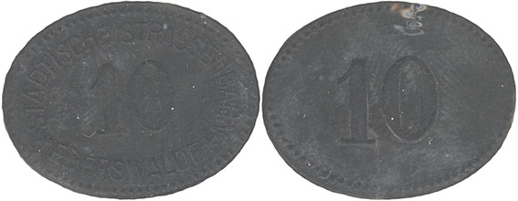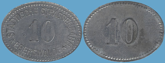 10 Pfennig; o. J.; Numismatische Hefte 3 - Eberswalde 19.; Vs.: STÄDTISCHE STRASSENBAHN * EBERSWALDE* um Wertzahl; Rs.: Wertzahl; Eisen; Dm= 24,2 x 18,5mm queroval |