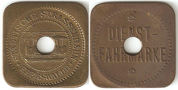 o.W.; o.J.; Menzel 7620.4; Vs.: STÄDTISCHE STRASSENBAHN * EBERSWALDE* um Straßenbahnwagen; Rs.: DIENST-FAHRMARKE; Messing; Dm= 22,2 x 22,2mm quadratisch, Ecken gerundet; oben 2x gelocht 4,5mm; Gewicht: 3,24g |