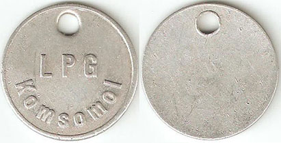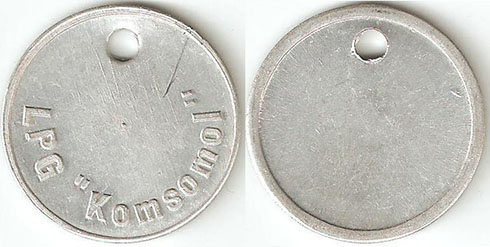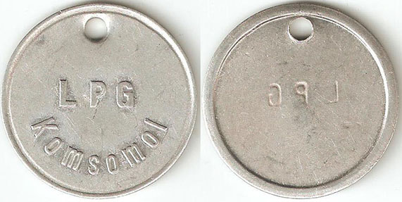 o. W.; o. J.; nicht katalogisiert; Vs.: mittig LPG, unten umlaufend "Komsomol"; Rs.: leer; Aluminium; oben 4mm gelocht; Dm=30,0mm |