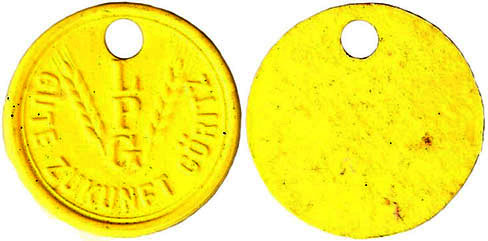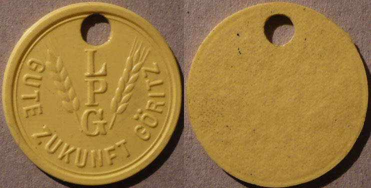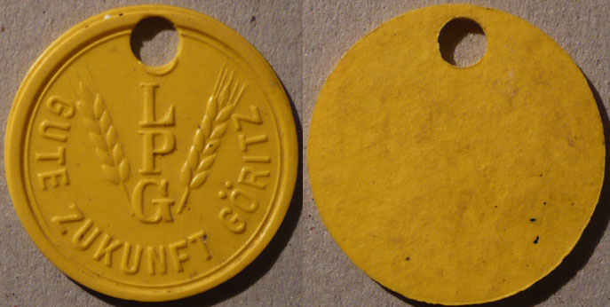 o. W.; o. J.; nicht katalogisiert; Vs.: LPG GUTE ZUKUNFT GÖRITZ und 2 Ähren; Rs.: leer; Kunststoff, Leuchtgelb; Dm=30,0mm; oben 4mm gelocht |