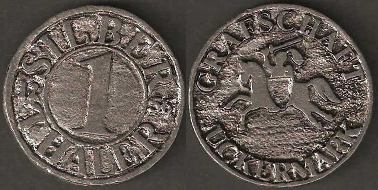 1 Silberthaler; o. J.; nicht katalogisiert; Vs.: "SILBER 1 THALER" links mittig "12" rechts mittig: 56; Rs.: "GRAFSCHAFT UCKERMARK" mittig: Reiterbildnis; Blei gegossen; Dm=32mm |