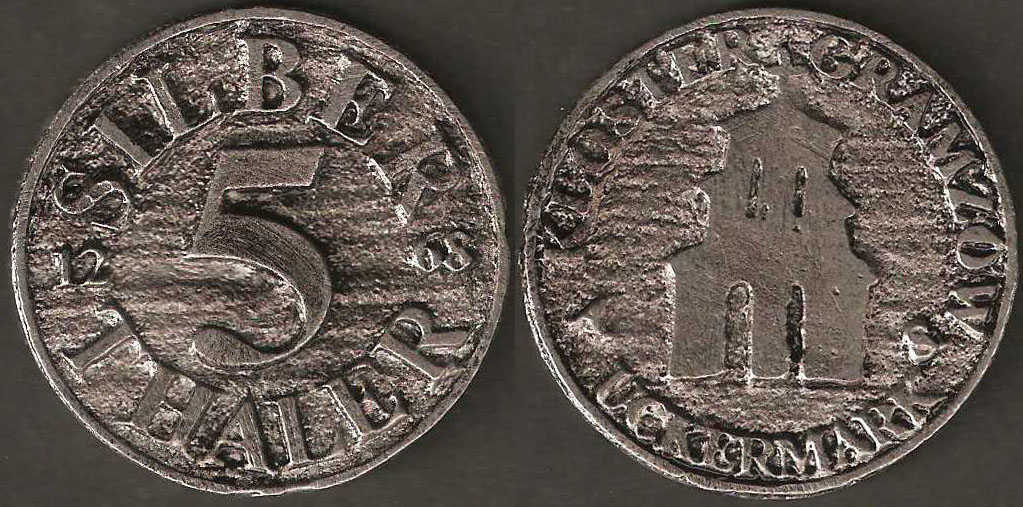 5 Silberthaler; o. J.; nicht katalogisiert; Vs.: "SILBER 5 THALER" links mittig "12" rechts mittig: 68; Rs.: "KLOSTER GRAMZOW UCKERMARK" mittig Bildnis des Klosters; Blei gegossen; Dm=42mm |