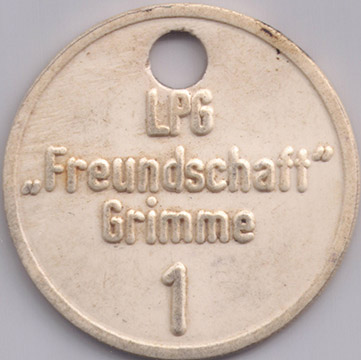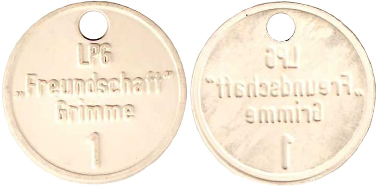 1; o. J.; nicht katalogisiert; Vs.: LPG "Freundschaft" Grimme; Rs.: leer; Aluminium; Dm=30,0mm; oben 4mm gelocht |