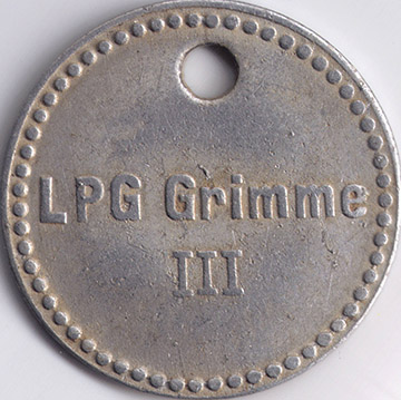 o. W.; o. J.; nicht katalogisiert; Vs.: LPG Grimme III; Rs.: leer; Aluminium; Dm=30,0mm; oben 4mm gelocht |