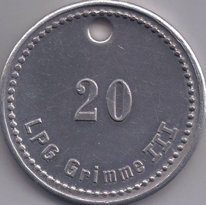 20; o. J.; nicht katalogisiert; Vs.: LPG Grimme III; Rs.: leer; Aluminium; Dm=35,0mm; oben 4mm gelocht |