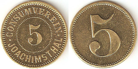 5 Pfennig; o. J.; Menzel 1863.1; Konsummünze; Vs.: CONSUMVEREIN JOACHIMSTHAL; Wertziffer; Rs.: leer; Glatter Rand; Messing; Dm=19,2mm |