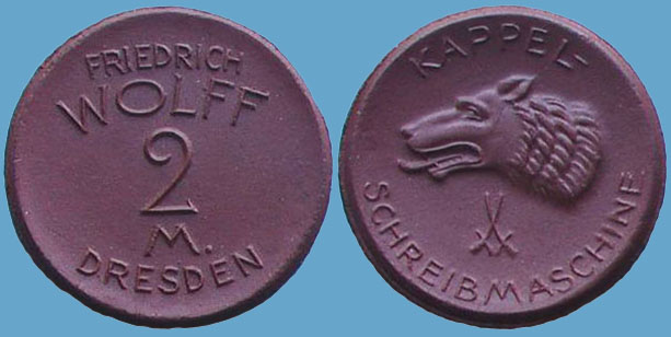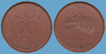 20 Pfennig; o.J. (1920) braun; Scheuch 282a; Vs.: oben umlaufend: FRIEDRICH / WOLFF / 20 / PF. / unten umlaufend: DRESDEN.; Rs.: Kopf eines Wolfes von links, darunter die Schwerter und oben umlaufend: KAPPEL und unten umlaufend: SCHREIBMASCHINE; Mit Ring geprägt; Glatter Rand; Gf; St.; Dm=28mm |