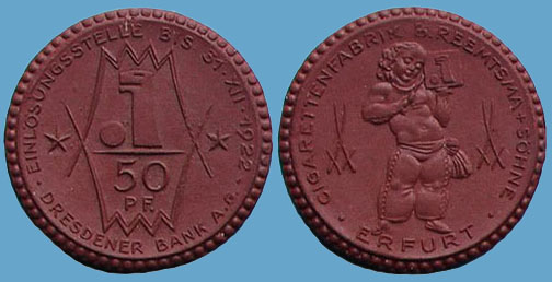 50 Pfennig; 1921 braun; Scheuch 285a; Vs.: In einem verzierten Sechseck mit verlängerten Seitenlinien: Firmenzeichen auf horizontaler Linie / 50 / PF. und an den verlängerten Außenlinien je ein fünfstrahliger Stern und oben umlaufend: EINLÖSUNGSSTELLE BIS 31.XII.1921 und unten umlaufend: DRESDNER BANK AG.; Rs.: Knabe, ein Paket mit Firmenzeichen tragend von vorn und links und rechts: die Schwerter und oben umlaufend: CIGARETTENFABRIK REEMTSMA + SÖHNE und unten umlaufend: . ERFURT .; Perlrand.; Gf; St.; Dm=32mm |