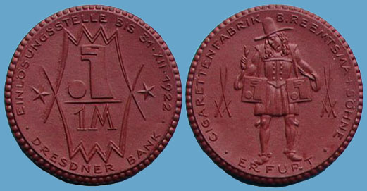 1 Mark; 1921 braun; Scheuch 287a; Vs.: Vs.: In einem verzierten Sechseck mit verlängerten Seitenlinien: Firmenzeichen auf horizontaler Linie / 1 / M und an den verlängerten Außenlinien je ein fünfstrahliger Stern und oben umlaufend: EINLÖSUNGSSTELLE BIS 31.XII.1921 und unten umlaufend: DRESDNER BANK AG.; Rs.: Mann in holländischer Tracht von vorn, in der rechten Hand eine Pfeife haltend, umhängend zwei Pakete mit Firmenzeichen, links und rechts: die Schwerter und oben umlaufend: CIGARETTENFABRIK REEMTSMA + SÖHNE und unten umlaufend: . ERFURT .; Perlrand.; Gf; St.; Dm=37mm |