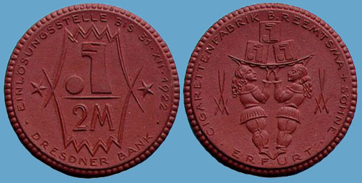 2 Mark; 1922 braun; Scheuch 290a; Vs.: wie vor, jedoch mit: BIS 31.XIII.1922 und unten umlaufend: DRESDNER BANK; Rs.: wie vor, jedoch mit oben umlaufend: CIGARETTENFABRIK B.REEMTSMA + SÖHNE und unten umlaufend: . ERFURT .; Auflage 900 Stück; Perlrand.; Stpl; St.; Dm=42mm |