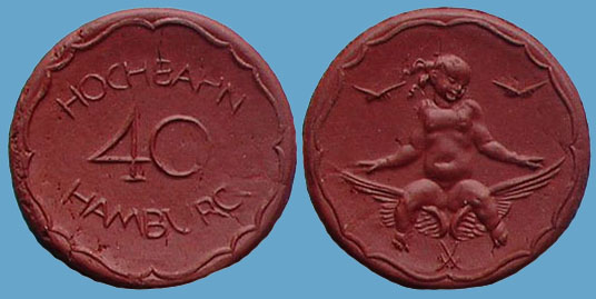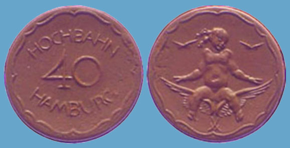 40 Pfennig; o.J. (1921) braun; Scheuch 295a; Vs.: In barocken Zierlinien: oben umlaufend: HOCHBAHN / 40 / Zeichen und unten umlaufend: HAMBURG; Rs.: In barocken Zierlinien: Putte mit wehenden Haaren auf einem Flügelpaar sitzend von vorn, links und rechts des Kopfes je ein fliegender Vogel und unten die Schwerter; Auflage 43.500 Stück; Glatter Rand.; Stpl; St.; Dm=27mm |