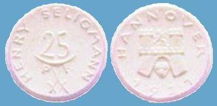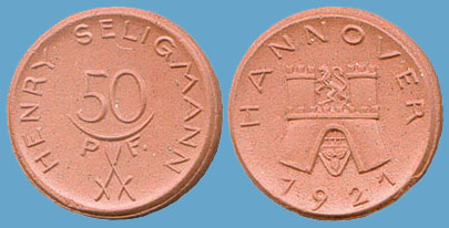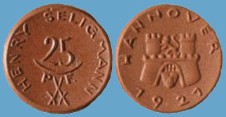 25 Pfennig; 1921 braun; Scheuch 296a; Vs.: 25 / Unterbogen / PF. und unten die Schwerter und oben umlaufend: HENRY SELIGMANN; Rs.: Stadtwappen und oben umlaufend: HANNOVER und unten umlaufend: 1921; Glatter Rand.; Gf; St.; Dm=19mm |