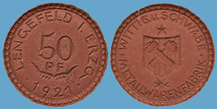 50 Pfennig; 1921 braun; Scheuch 302a; Wittig u. Schwabe; Vs.: 50 / PF / Zeichen und oben umlaufend: LENGEFELD I. ERZG und unten umlaufend: 1921; Rs.: Stadtwappen, darüber ein fünfstraliger Stern und darunter: die Schwerter und oben umlaufend: WITTIG U. SCHWABE und unten umlaufend: . METALLWARENFABRIK .; Auflage 8.900 Stück; Perlrand.; Stpl; St.; Dm=19mm |