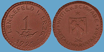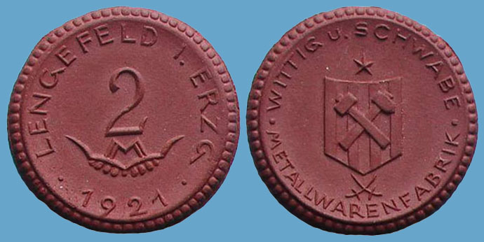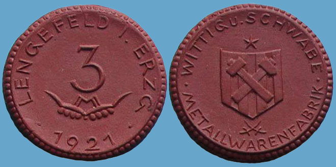 1 Mark; 1921 braun; Scheuch 303a; Vs.: 1 / M / Zeichen und oben umlaufend: LENGEFELD I. ERZG und unten umlaufend: . 1921 .; Rs.: Stadtwappen, darüber ein fünfstraliger Stern und darunter: die Schwerter und oben umlaufend: WITTIG U. SCHWABE und unten umlaufend: . METALLWARENFABRIK .; Auflage 7.800 Stück; Perlrand; Stpl; St.; Dm=22mm |
