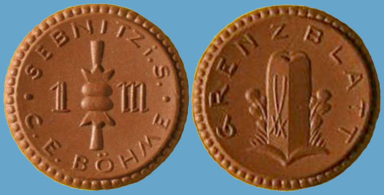 50 Pfennig; o.J. (1921) braun; Scheuch 307a; Vs.: Zwei senkrechte Farbenreiber, links 50 und rechts: PF und oben umlaufend: SEBNITZ I.S. und unten umlaufend: O.E. BÖHME; Rs.: Grenzstein und darauf die Schwerter und links und rechts daran je ein Eichenblatt und oben umlaufend: GRENZBLATT; Perlrand; Gf; St.; Dm=22mm |