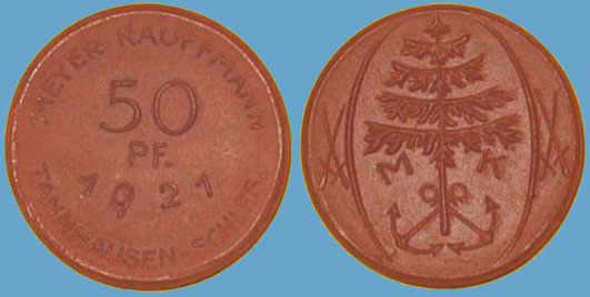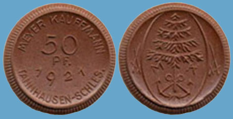 50 Pfennig; 1921 braun; Scheuch 309a; Vs.: 50 / PF. / darunter umlaufend: 1921 und oben umlaufend: MEYER KAUFFMANN und unten umlaufend: TANNHAUSEN - SCHLES.; Rs.: Im Oval: Fabrikzeichen und links und rechts die Schwerter; Glatter Rand.; Gf; St.; Dm=24mm |
