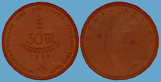 ohne Wertangabe; 1922 braun; Scheuch 460a; Vs.: Doppelpfeil (11 mm hoch) / unten umlaufend: STUDENTENTALER / 1922 / die Schwerter, oben umlaufend: WIRTSCHAFTSHILFE DER DEUTSCHEN STUDENTENSCHAFT; Rs.: wie vor; Auflage 3.900 Stück; Perlrand.; Stpl; St.; Dm=50mm |