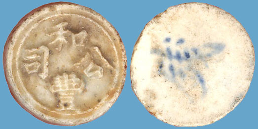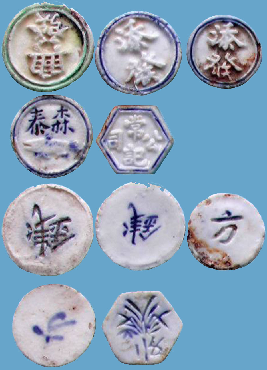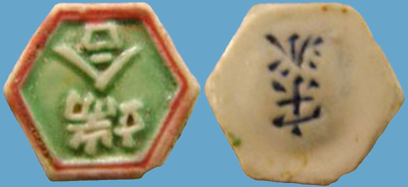 seit 1770 bis 1873 weiß; Scheuch 611; Porzellanmünze - weiß mit farbigen chinesischen und siamesischen Schriftzeichen. Bemerkung: Von Spielhäusern in großer Menge - 890 verschiedene Arten - (nach Joseph Haas in seinem Buch "Siamese Coinage") ausgegeben und später von der Regierung als Zahlungsmittel anerkannt. Sie wurden 1873 verboten und blieben aber bis etwa 1880 in Umlauf. |