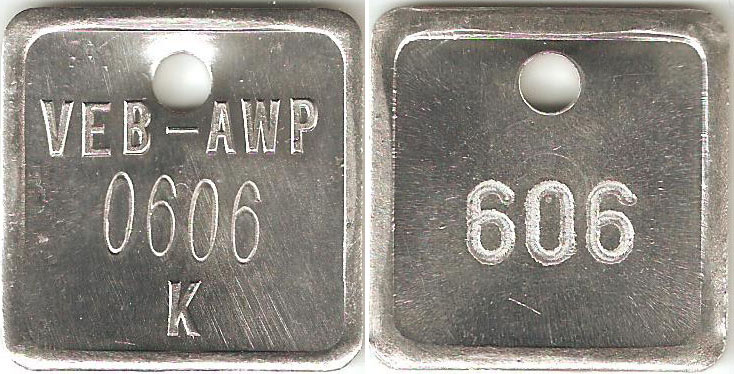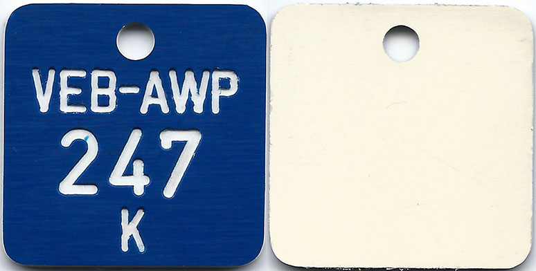 o. W.; o. J.; nicht katalogisiert; Vs.: geprägt: VEB-AWP, mittig grviert: Zahl, darunter "K"; Rs.: leer; Aluminium; Dm=30,5 x 30,5mm eckig; oben mittig 4mm gelocht |