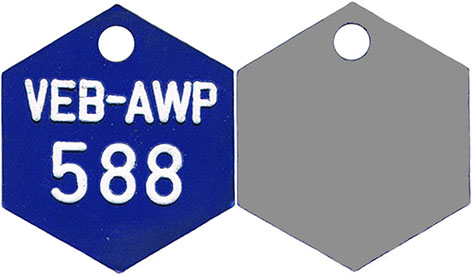 o. W.; o. J.; nicht katalogisiert; Vs.: blau, weiß graviert: VEB-AWP, darunter WZ; Rs.: grau, leer; 3-schichtiger Kunststoff; 6-eckig; oben mittig 4mm gelocht |