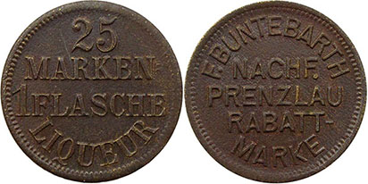 o. J.; nicht katalogisiert; Rs.: "25 MARKEN (WZ) FLASCHE LIQUEUR"; Kupfer; Dm=20,5mm; Gewicht: 2,25 Gramm |