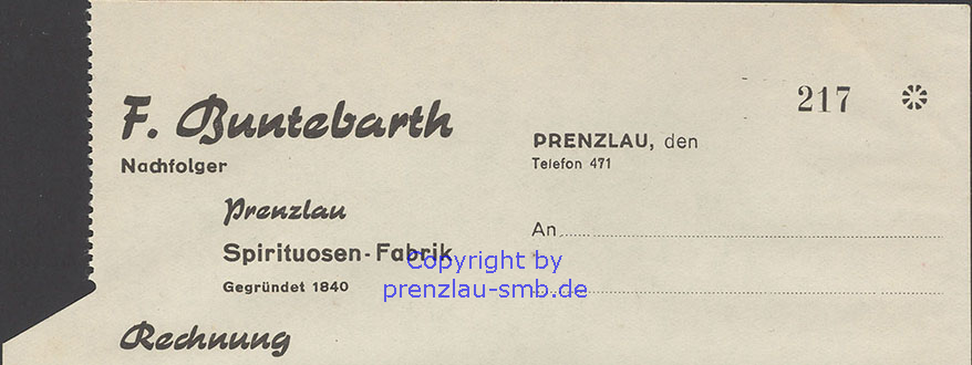 Geschichtliches • Buntebarth - Liqueur ![]() • Firmengründer Buntebarth, Friedrich (geb. am 16.3.1814 in Cremmen; gest. 4.7.1876 in Prenzlau) eröffnete 1840 sein Geschäft in der Friedrichstraße 203 (bis 1871) • von 1871 bis 1883 führte das Geschäft Wilhelm Eickhoff ![]() • von 1883 bis 1895 führte das Geschäft Wilhelm Nehls • von 1895 bis 1899 übernahm das Geschäft Ernst Nehls (Sohn von Wilhelm Nehls) • 1899 kaufte Ernst Nehls das Grundstück 320/21 in der Baustraße und führte dort das Geschäft bis 1931 • von 1931 bis 1945 führte das Geschäft in der Baustraße Ernst Nehls jun. (Sohn des Ernst Nehls) • verkauft wurde der Buntebarth-Liqueur u.a. in der Stettiner Straße 2 ![]() • 1945 brannten die Gebäude in der Baustraße ab • 1946 baute Karl Nehls (Bruder von Ernst Nehls jun.) das Geschäft in der Baustraße wieder auf und führte es bis 1952 weiter ![]() Quellen: • Adreßbücher der Stadt Prenzlau in mehreren Jahrgängen • "Die Prenzlauer Straßen und ihre Geschichte", Alfred Hinrichs, maschinenschriftliche Aufzeichnungen, 1954 • "Mitteldeutsche Familienkunde", Ausg. 7, 1982, S. 251 • "Stadtgeschichte und Daten über Prenzlau", 1985-1989 (maschinenschriftlich) |