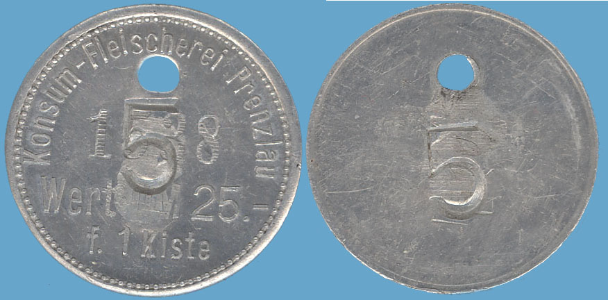 25 DM; o. J. (1951-1964); Menzel 37186.1; Vs.: Perlrand, oben umlaufend: Konsum-Fleischerei Prenzlau / Kontrollnummer / Wert DM 25,- / für 1 Kiste; Rs.: Glatter Rand, leer; oben 4,5mm gelocht; Aluminium; Dm=36,0mm; Gew.: 15,6g Anmerkung: Die Wertmarken wurden nach 1964 zweckentfremdet, der Wert weggeschliffen und die Marke beidseitig, zweistellig überstempelt. |