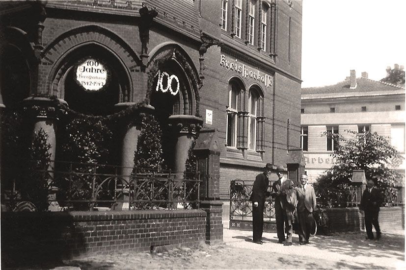 Geschichtliches • gegründet 1842 als Spar- und Giro-Kasse unter Garantie des Kreises Prenzlau • Hauptstelle in Prenzlau im Landhaus in der Stettiner Straße 37 • 1885 betrug das Guthaben der Sparer 2.505.000,00 Mark und es waren 8.281 Sparbücher ausgegeben • das Kuratorium der Sparkasse besteht 1886 aus dem Geheimen Regierungs- und Landrat v. Winterfeldt, dem Bürgermeister Mertens und Rechnungsrat Jahnke • Verwalter der Kasse waren 1886 der Rentmeister Krause und der Controlleur Schulz • 1920 Spareinlage in Höhe von 21.530.661,89 Mark auf 20.527 Konten • 1925 erwähnt als Kreis- Spar- u. Girokasse Prenzlau • 2 1/4 Millionen Reichsmark Gesamteinlagen waren am 31. Januar 1925 vorhanden • Nebenstellen in Brüssow und Fürstenwerder • 1928 erwähnt als Kreiskommunalkasse, Kreissparkasse und Kreisgirokasse • Nebenstellen in Brüssow, Fürstenwerder und Zerrenthin • 1931 erwähnt als Kreisgirokasse • 1938 erwähnt als "Sparkasse des Prenzlauer Kreises", Kreissparkassendirektor Schwerin ![]() • am 1. Juli 1994 schlossen sich die Kreissparkassen Angermünde, Prenzlau und Templin zur "Sparkasse Uckermark" zusammen • am 4. Februar 1995 wurde die Datenverarbeitung der Sparkassen vereinigt Quellen: • Adreßbücher der Stadt Prenzlau in mehreren Jahrgängen • "Prenzlau, die ehemalige Hauptstadt der Uckermark", F. Ziegler, Verlag Theophil Biller, Prenzlau, 1886, S. 147 • "Die Prenzlauer Straßen und ihre Geschichte", Alfred Hinrichs, maschinenschriftliche Aufzeichnungen, 1954, S. 15-16 • Mitteilung über die technische Fusion der Sparkasse Uckermark vom 1. November 1994 |